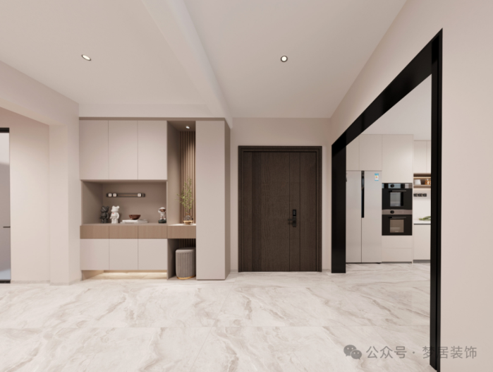 玄关处打造一门到顶收纳柜,四段式设计十分方便日常收纳,开放格的搭配兼具装饰功能,让归家的时刻更温馨舒适。简约的无把手柜门设计,线条流畅,简约大方。