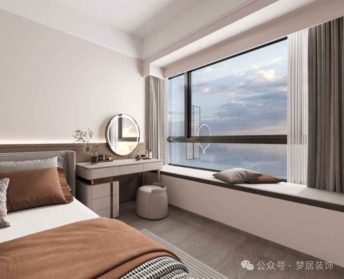 设置玻璃墙解决卫生间正对床的问题,保留空间通透感,实现空间功能分区。一面大窗将自然光纳入室内,空间通透又舒适。