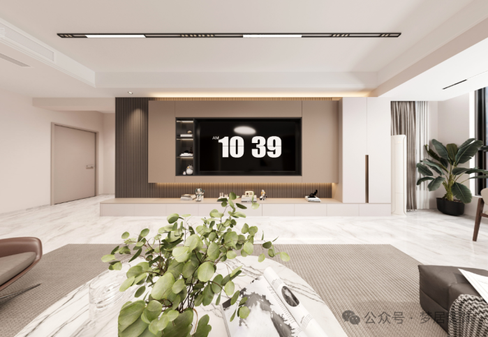 悬浮电视背景墙搭配温润的木格栅,凸显空间沉稳、时尚的气质。书籍与摆件作为空间的点缀,活跃空间气氛,时尚又不张扬。