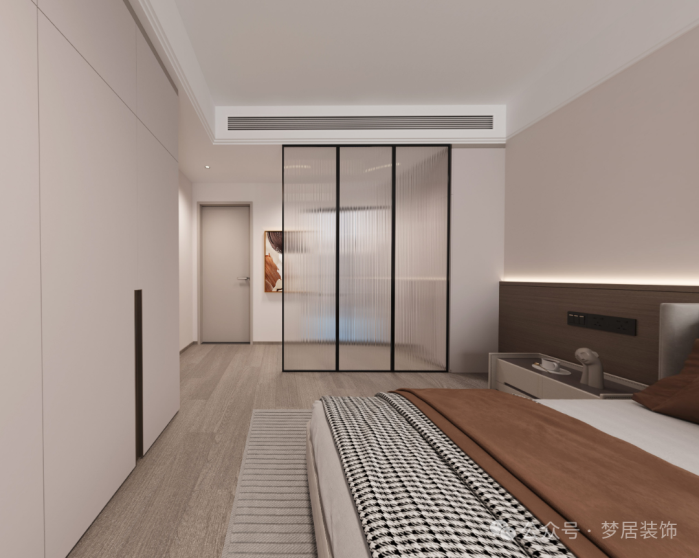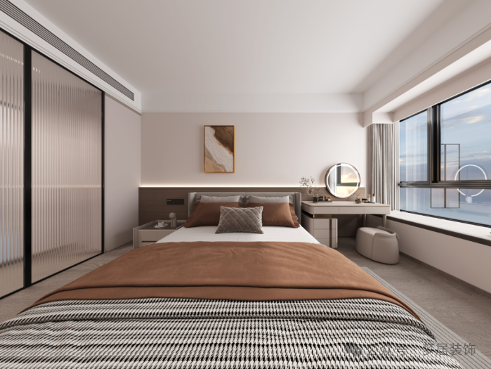 主卧延续客厅色调,浅灰杏墙面细腻亲和,辅以木色床头背景墙和布艺床品,体现空间层次,感受居家时光的宁静和温馨。