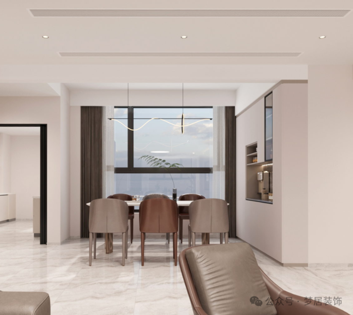餐厅选用简约造型长桌,岩板定制的桌面清新自然。皮质餐椅触感细腻,坐享舒适与惬意,棕、咖色搭配,整体简约内敛但不显沉闷。