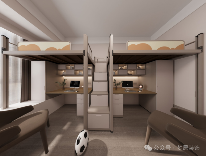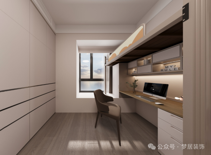 儿童房色调安静舒缓,上床下桌的设计打造出学习和休憩空间,梯柜+底抽,孩子的玩具再多也能装得下,配备的护栏守护孩子的安全,为孩子们布置出一个现代舒适又安全温馨的卧房。