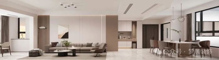 客厅无主灯设计,灯光组合搭配丰富了空间层次,呈现出朗阔旷达的格局。宁静的空间散发着轻熟魅力,展现出舒适与气质的统一,优雅而精致。