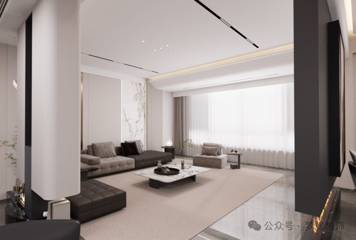 客厅空间以浅色为基调,深色家具成为空间视觉焦点。浅杏色墙面与纯白色天花营造纯净感,灰色大理石地面光洁如镜,倒映出暖色灯光,空间呈现温馨质感。