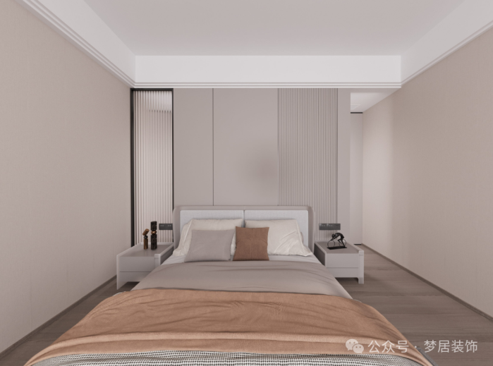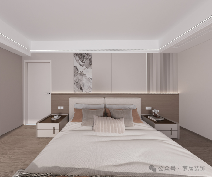 次卧设计时尚温馨,床头背景墙通过材质与造型的变化增加视觉层次,嵌入式灯带为夜晚休憩提供柔和照明,打造舒适又兼具质感的休憩空间。