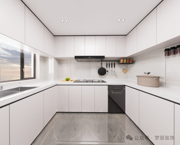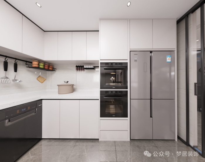 厨房采用U型布局,白色橱柜搭配黑色线条装饰,简洁大气。集成嵌入式厨电,实现功能一体化,厨房看起来更干净整洁,玻璃推拉门让厨房空间更明亮通透。