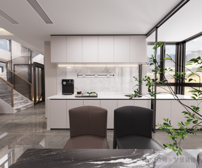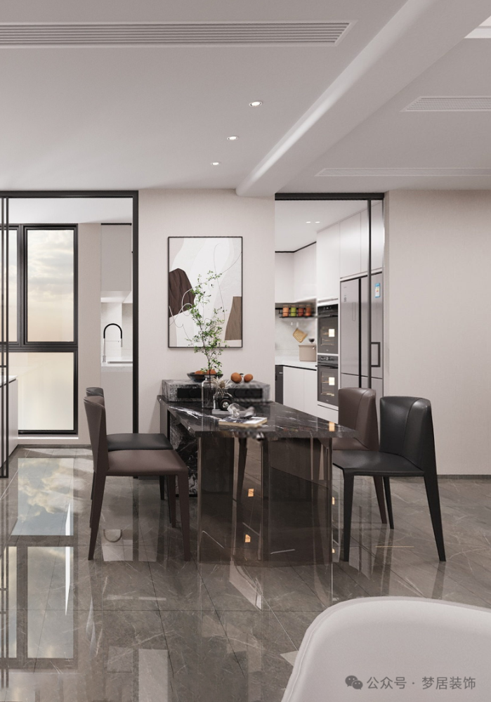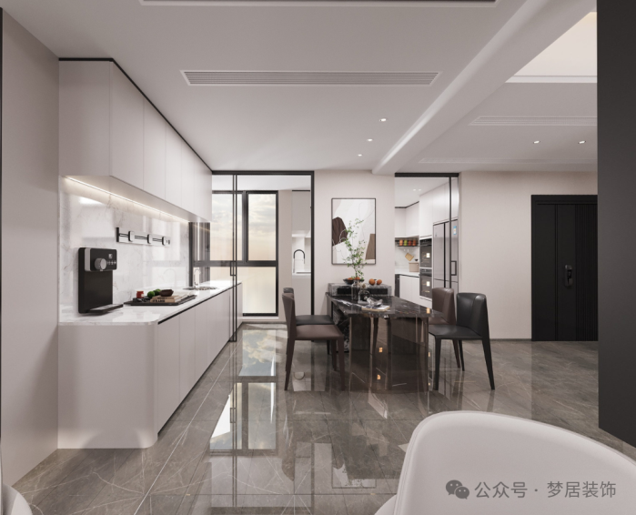 西厨区延续整体空间风格设计,与餐厅、客厅区域联动,增强区域间的视觉与功能互动。极简的设计语言剥离冗余装饰,用质感与细节陈设塑造简约而精致的空间气质。
