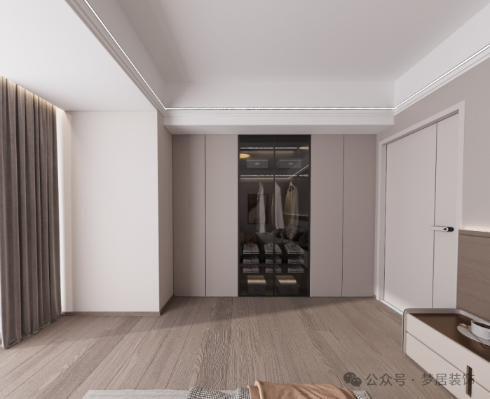 空间通过床头背景墙自然分隔空间,打造出步入式衣帽间,实现空间收纳需求,打造专属的衣物收纳与穿搭空间。