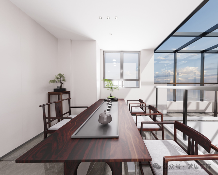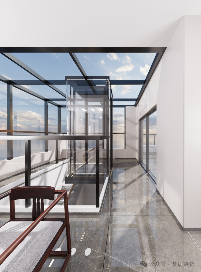 顶层空间搭建阳光房,打造茶室和露台空间。阳光房将天空、云彩等自然景观引入室内,使茶室成为一个可品茗、可观景的复合型空间。玻璃轿厢电梯与阳光房设计融为一体,提升住宅便利性。