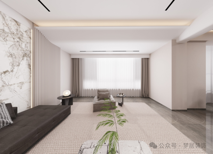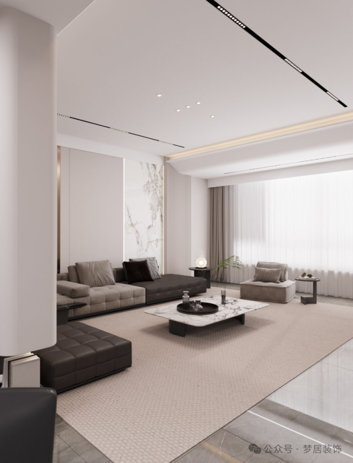 天花采用无主灯设计,异形吊顶平滑过渡客厅与阳台空间。浅米色编织地毯增加舒适度与温馨氛围,不同材质的碰撞丰富空间层次,极简的设计呈现出一个“治愈系” 空间。