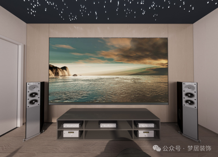 影音室采用星空顶设计,营造出沉浸式观影氛围。墙面采用木质板材,起到声学优化作用,自然的木质纹理为影院空间增添了温暖质感,打造出高品质的家庭影院空间。