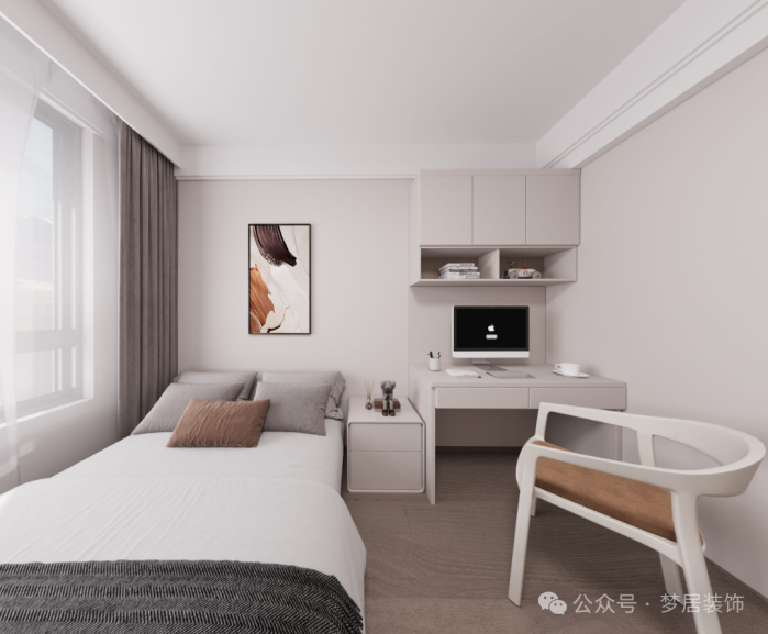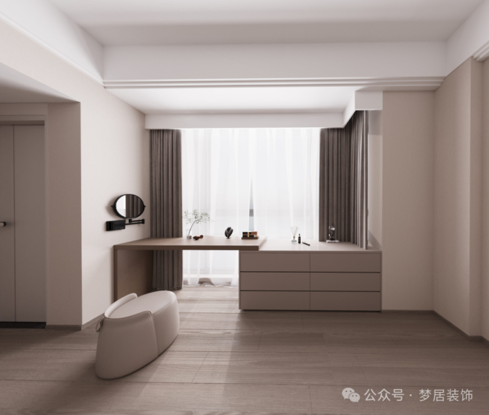 主卧以浅灰、浅杏为主色调,营造柔和温馨的空间氛围,打造放松治愈的休憩空间,木质地板提升舒适度。靠窗打造可移动式梳妆柜,满足日常美妆与收纳需求。