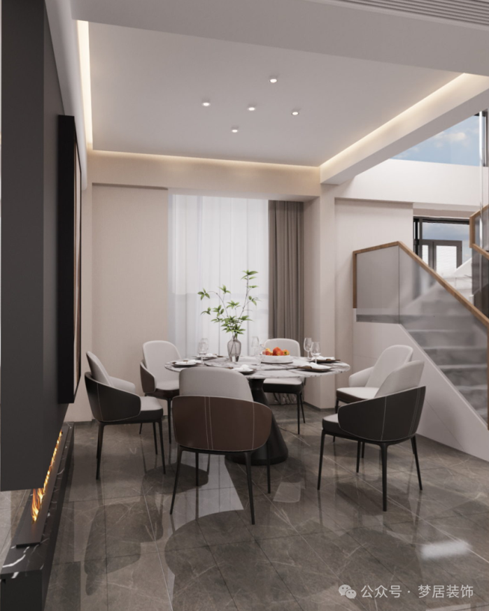 一层的空间非常开阔,设计师将其打造成客、餐、厨一体的生活空间。客、餐厅以一面悬浮电视墙进行空间分隔,增强了空间的通透感与互动性。餐厅简约的设计大气温馨。