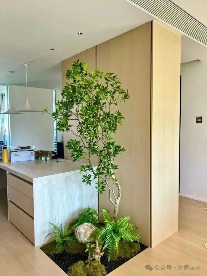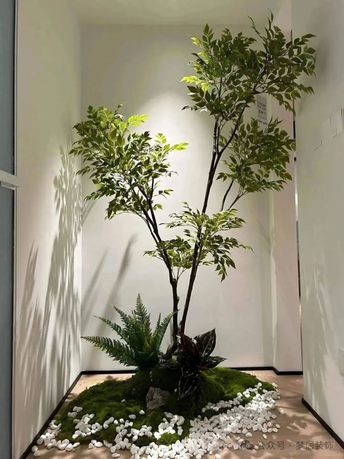 在客厅中设计一处“树景”,形成一处独特又好看的景观,一点巧思,呈现空间非常喜人的一个角落。