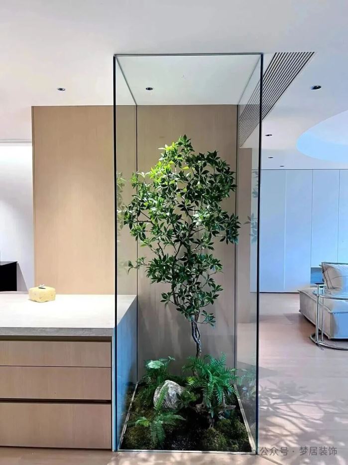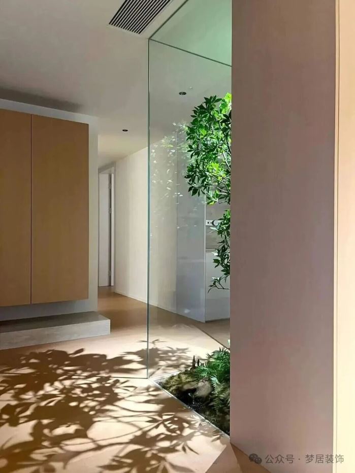装修铺地时留出的10公分下沉空间,景观和地面齐平,浅木色柜子和清透玻璃映衬着树,太美了!