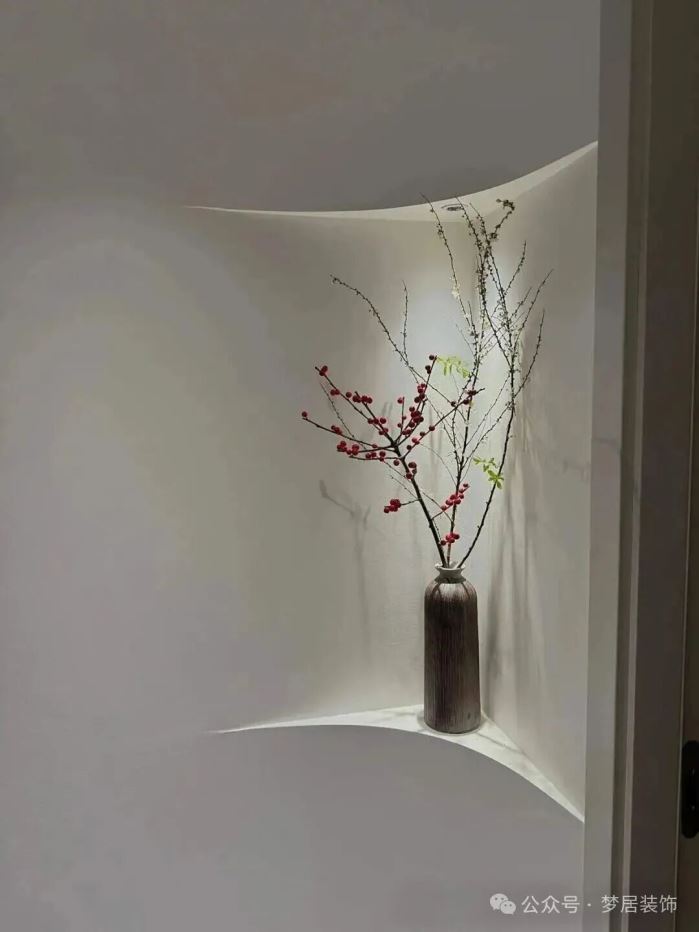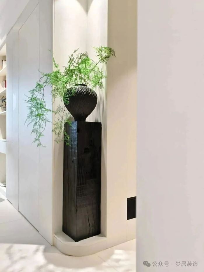 柜子与墙面形成内置角,底部连接一体,弧形过度减少碰撞,布置上花瓶绿植,简约又高级。