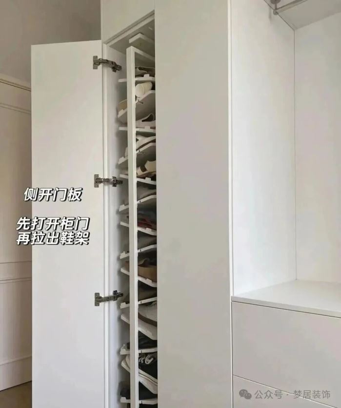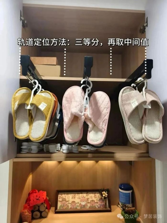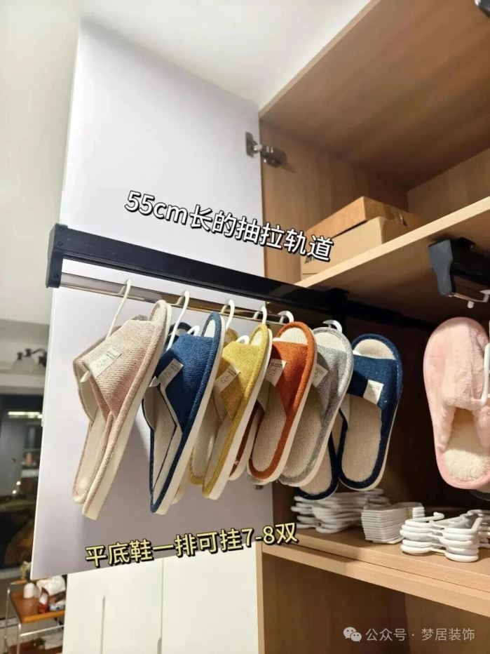 上柜安装抽拉轨道,搭配挂鞋架,一排就可以挂七八双鞋子。