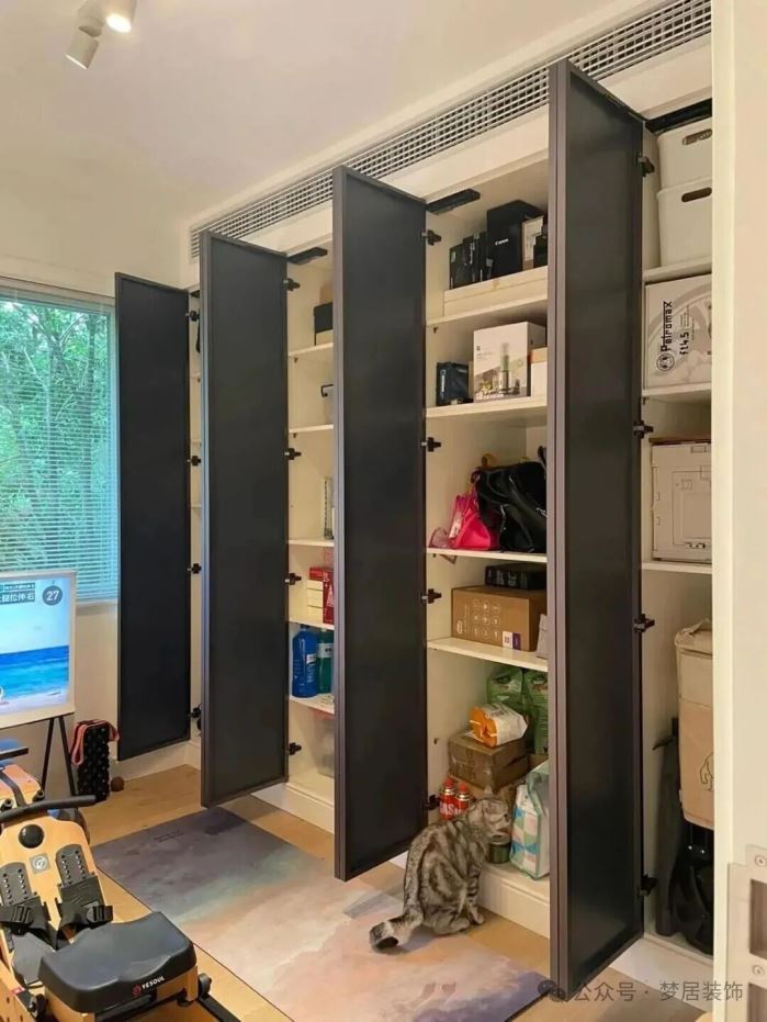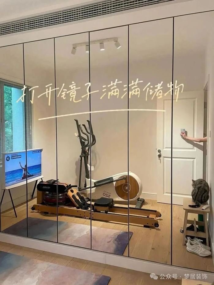 定制一面镜柜,关上柜门是舒适的健身房,打开则是整排收纳柜,可以收纳各种杂物,解决了家里70%的收纳问题。