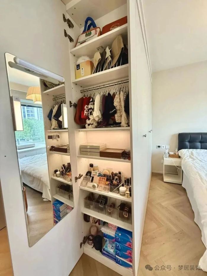 卧室小,放梳妆台占地方,可以在衣柜侧边打造个20公分薄柜,柜门安装上梳妆镜。