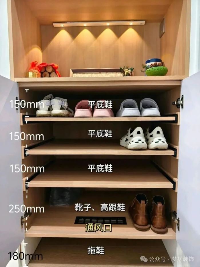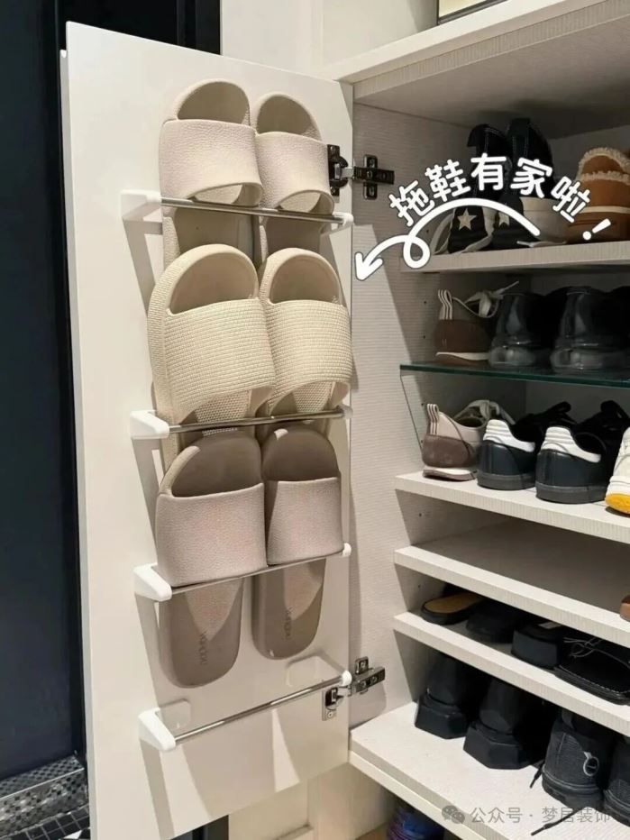 若是鞋柜只能做40~45cm深,放下鞋子还有空间,可以将层板内退10~12cm,这样门板上就能用来收纳拖鞋了。