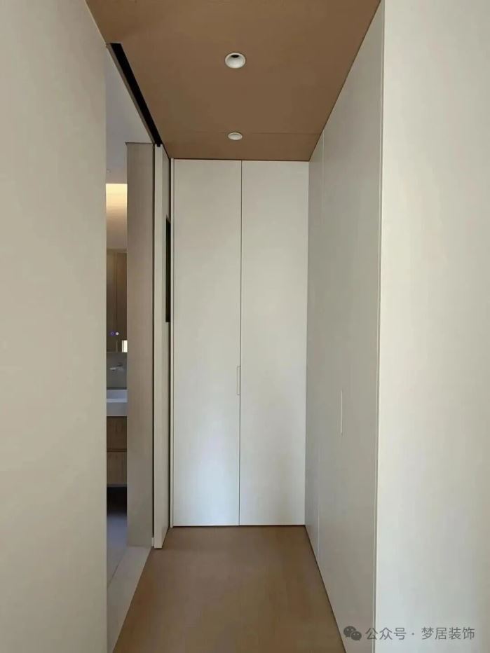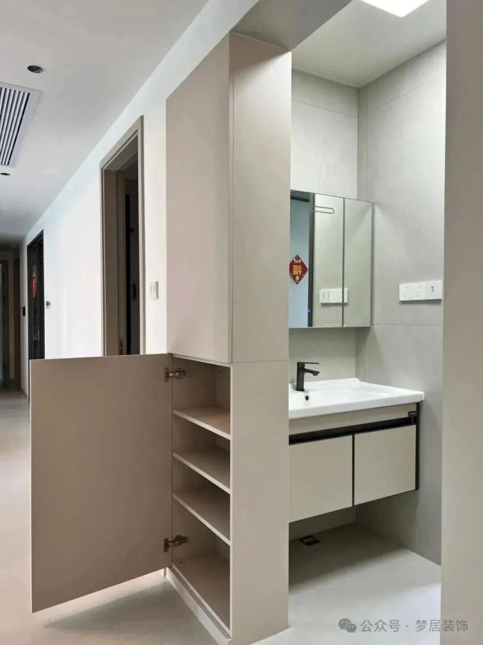卫生间干区移在门外需要做墙面隔断的,可以像这样装个双面高柜隔断,入住后收纳力直接拉满。