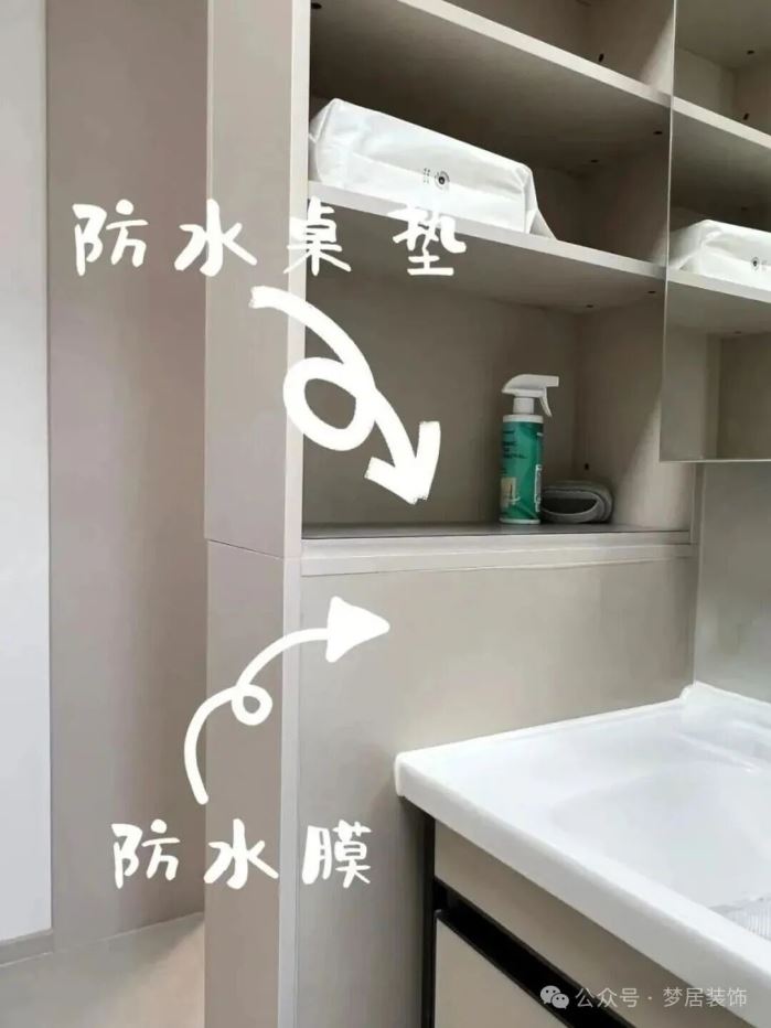 做柜子前提前考虑防水,可以在侧面贴防水膜,台面放防水垫。