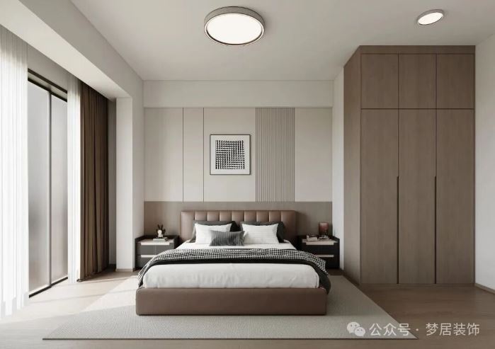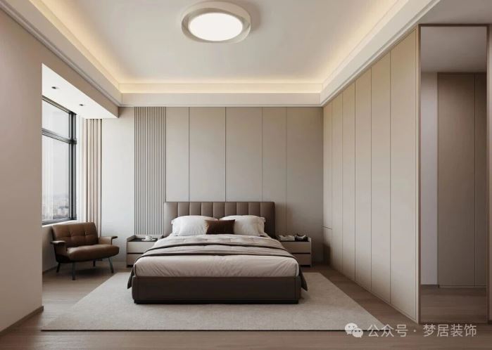 主卧设计简约柔和,浅灰色床头背景墙搭配木地板构建舒缓基调,深棕皮质床头靠背与同色系单人沙发椅质感十足,营造出舒适又松弛感的私密空间。