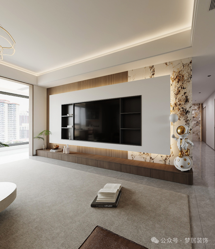 悬浮电视墙搭配木饰面和岩板,灯带光线打在木饰面和岩板上,一眼惊艳,质感高级。