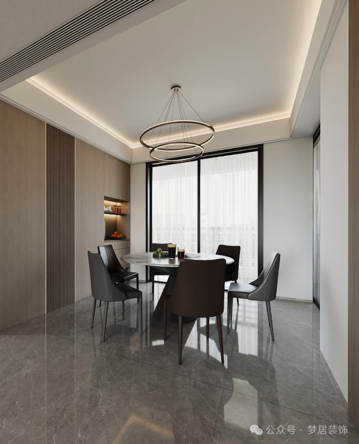圆形餐桌椅合围出一家人温馨的日常。公卫淋浴区内移,打造嵌入式餐边柜与餐厅墙面齐平,整洁又舒适。