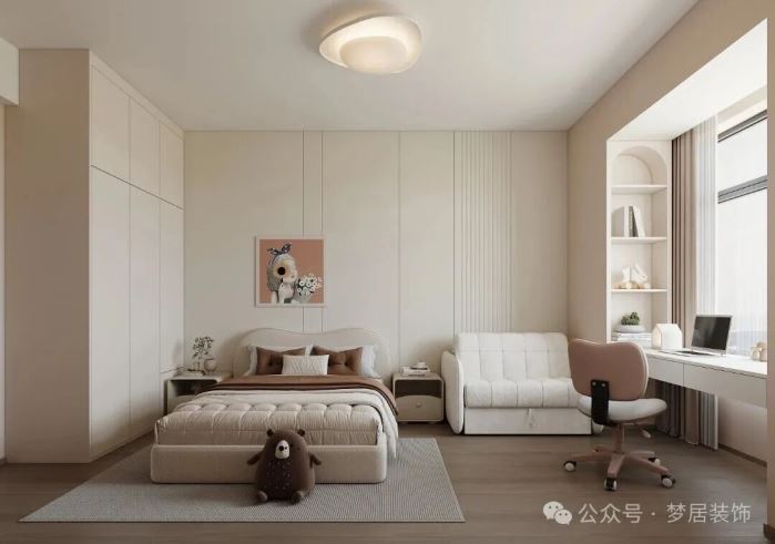 女孩房设计俏皮可爱,窗口处定制悬浮书桌打造学习区,兼顾居住的舒适感与成长所需的实用功能,温馨又实用。
