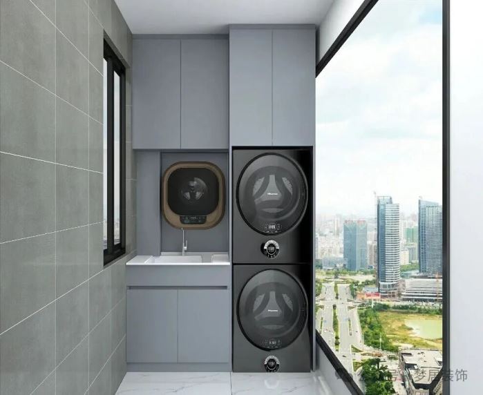 生活阳台打造阳台柜,嵌入洗衣机和烘干机,收纳洗护用品,整洁又干净。旁边还配备洗手台,洗小件衣物轻松方便。