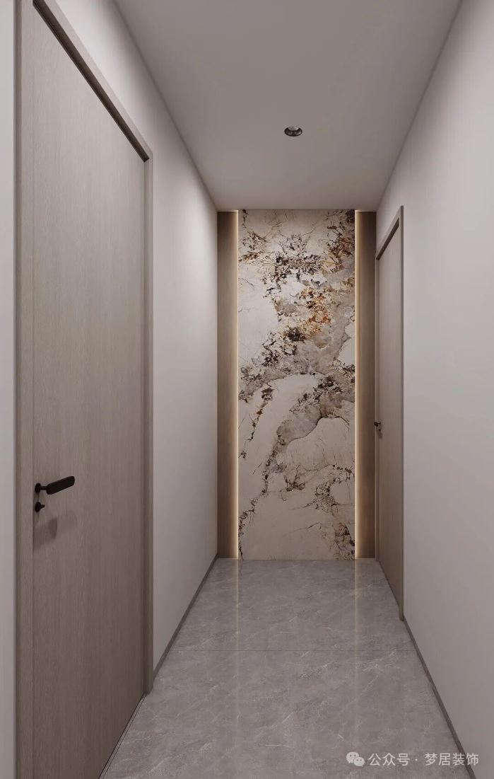 走廊玄关精致的岩板墙设计打破狭长空间的单调感,搭配隐形灯带打造视觉焦点,提升空间质感。