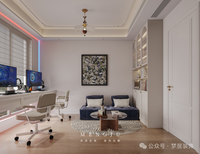 家中独立出一个区域为业主打造电竞休闲空间。设计打破法式的温柔基调,融入个性元素,一侧设计收纳柜用于存放电竞配件,保持空间整洁,打造出兼具格调与实用性的娱乐放松天地。