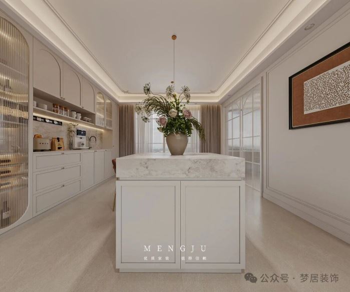 法式设计打造出浪漫的餐厅氛围。法式圆弧柔化空间,岛台增加收纳,大理石台面增加空间质感。