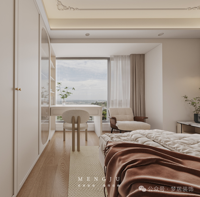 床尾通顶法式衣柜搭配金属拉手,简约大气。靠窗打造梳妆台,搭配单人沙发椅,闲时可在此阅读、发呆,享受时光。