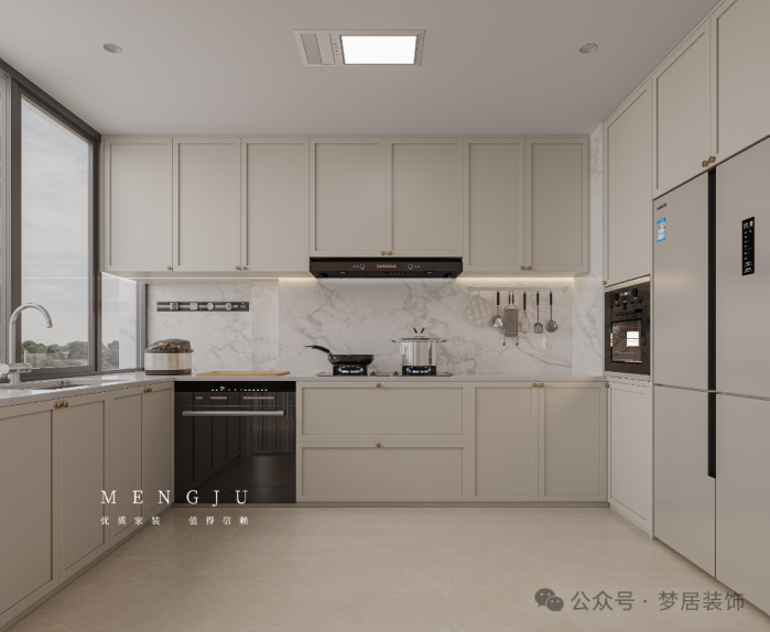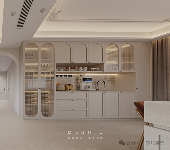 厨房采用U型布局,增加操作台与收纳空间。奶白色地柜➕奶白色吊柜,带骨骼线造型,大气耐看。柜门搭配黄铜拉手,延续全屋的法式精致细节,同时预留嵌入式电器位置,厨房整体舒适又有层次感,让烹饪更从容。