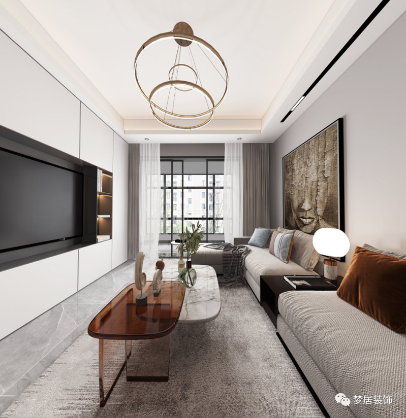 现代简约设计风格追求自由,室内空间开敞通透。电视背景墙为整排收纳柜满足收纳所需,电视内嵌让视觉更整体。使用玻璃、不锈钢等新型材料作为辅材,给人的感觉前卫大气。