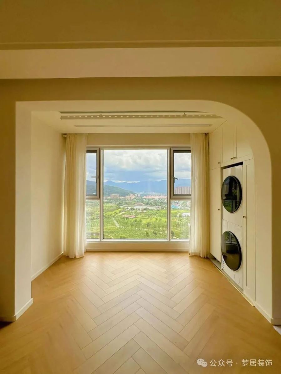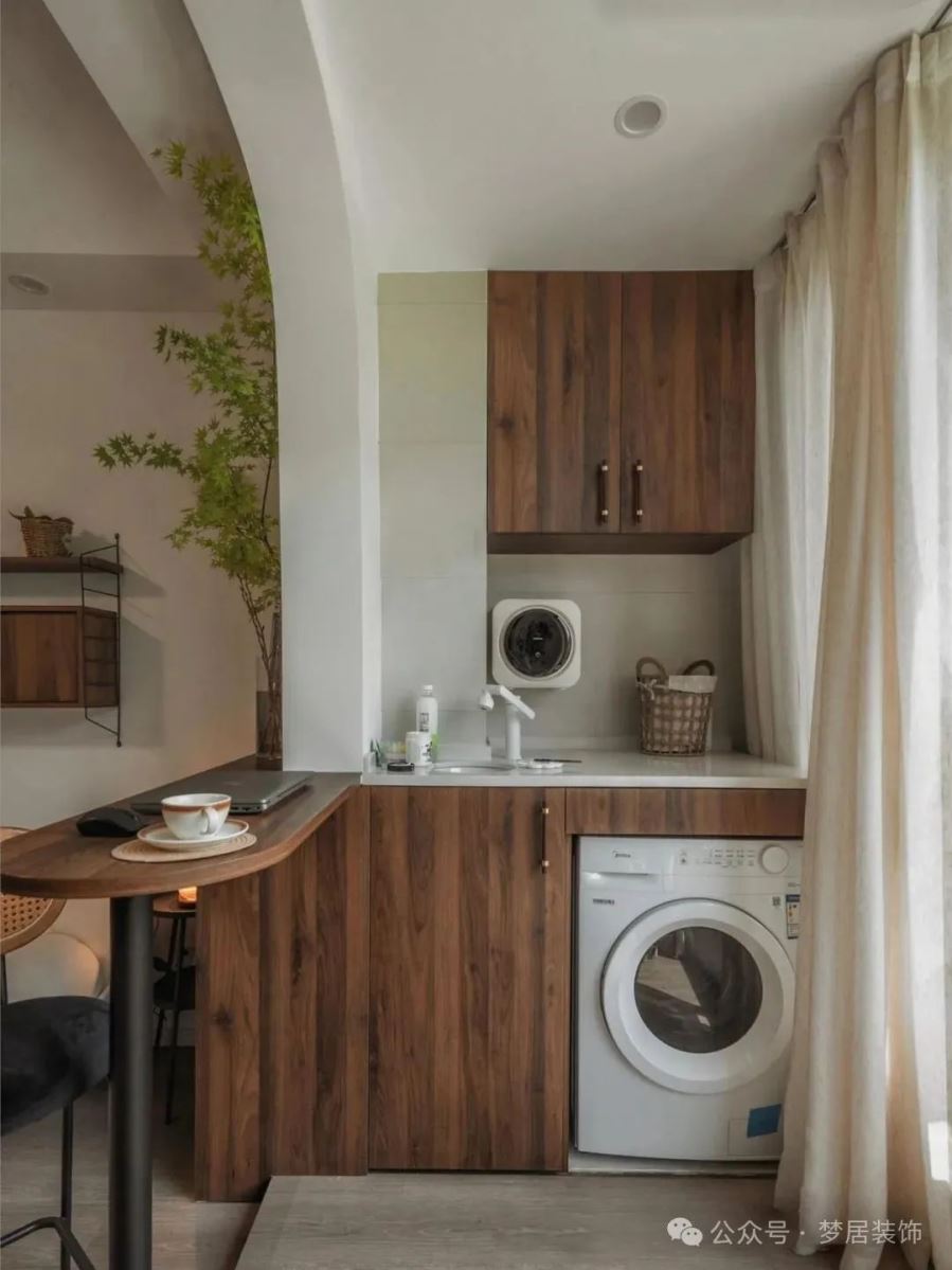 如果墙垛较窄的情况下,洗衣机、烘干机等设备嵌入柜子可能会凸出部分机体。
